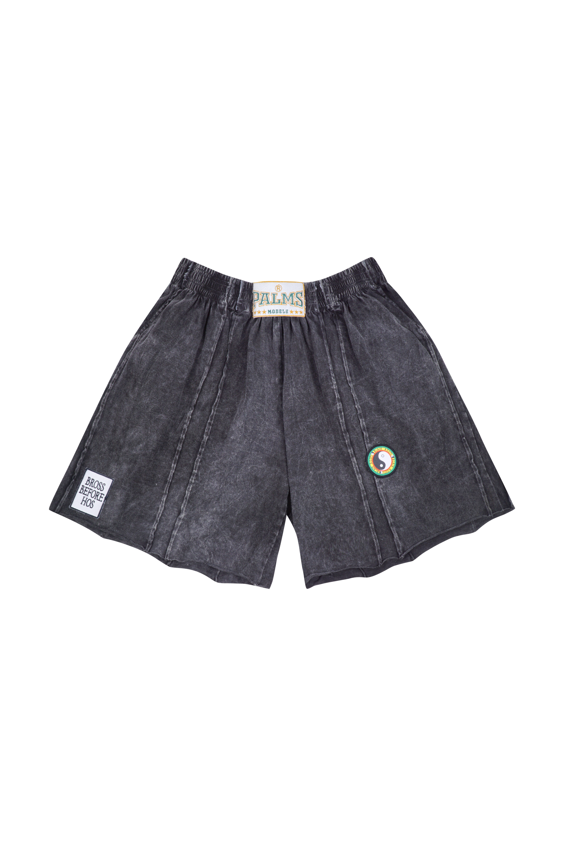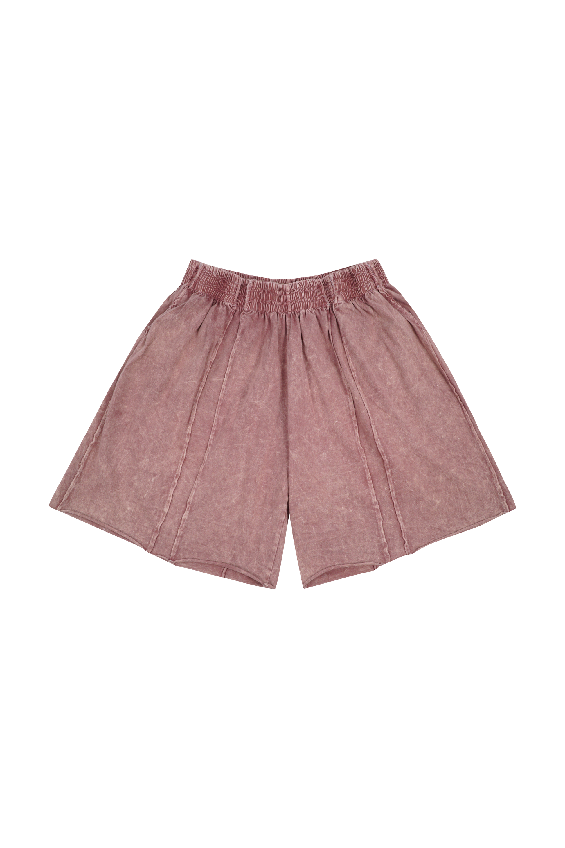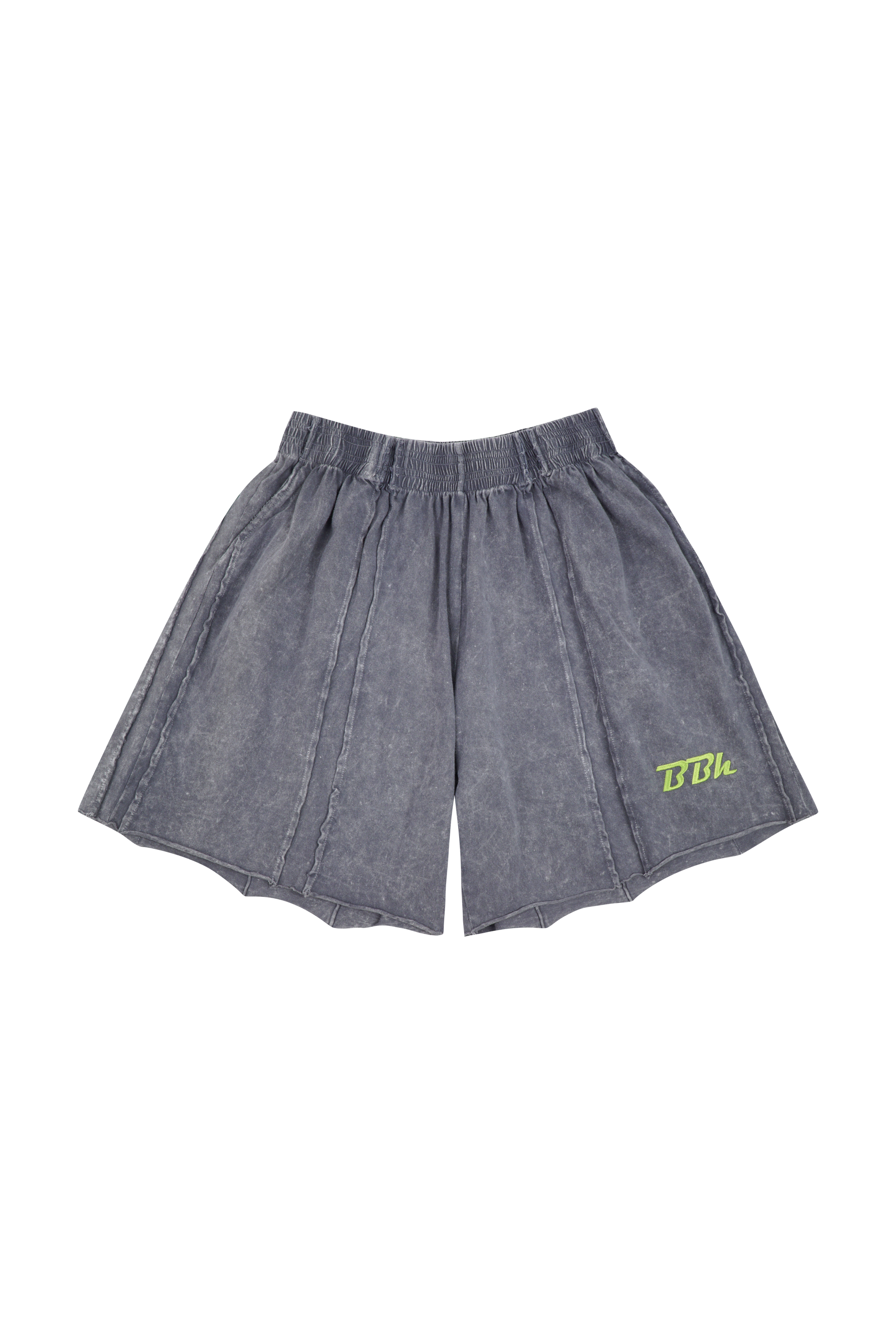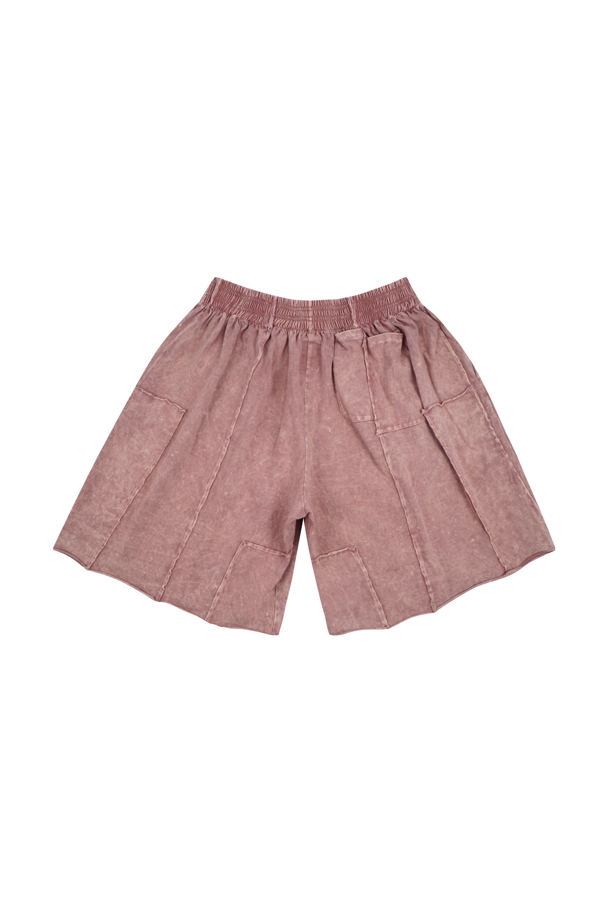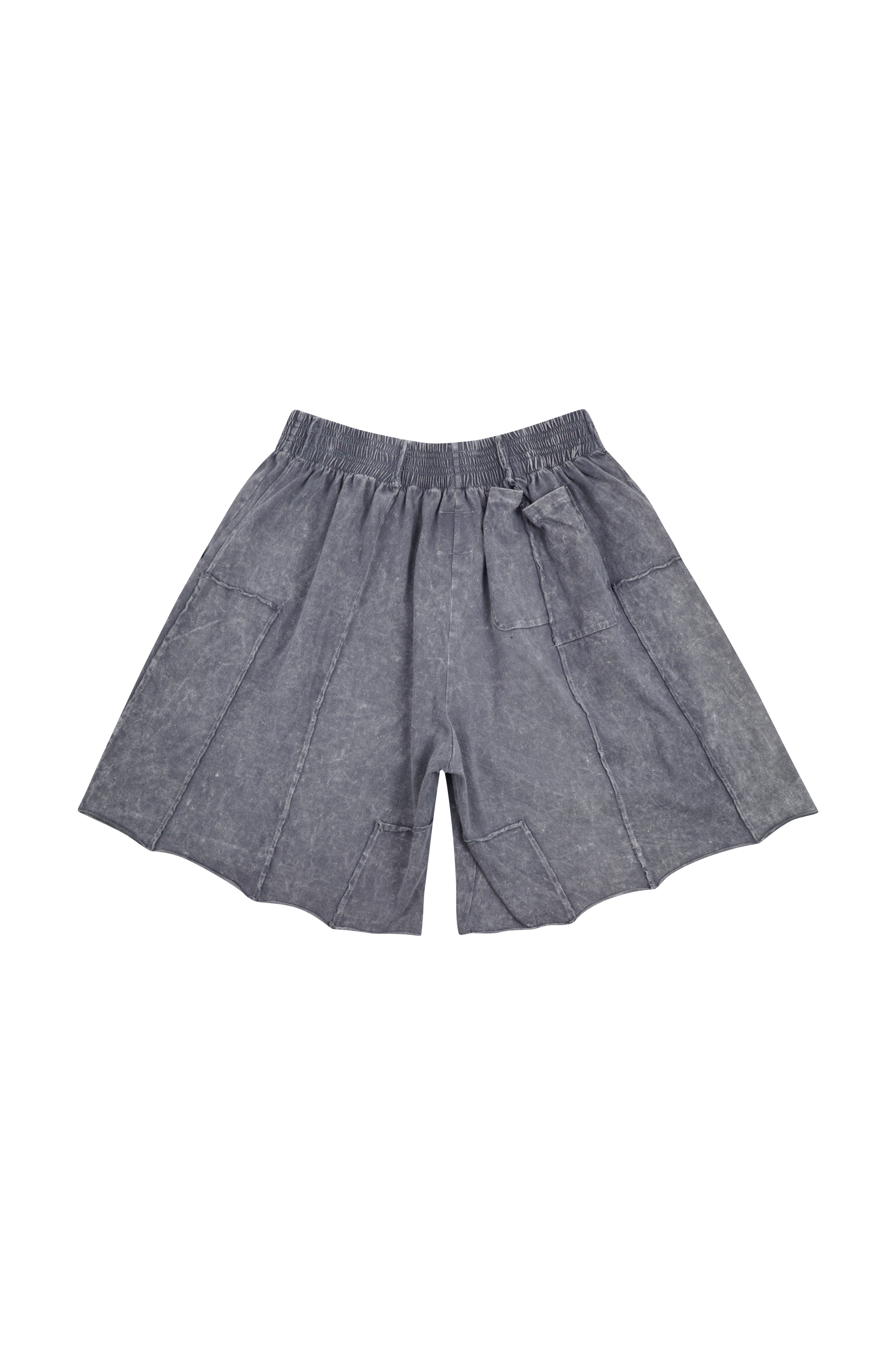 These shorts feature a unique panel construction with visible decorative seams that add a distinctive, stylish touch. The relaxed silhouette with a slight flare ensures comfort and ease of movement, while the soft elastic waistband allows for a versatile fit at the waist or hips, making the design gender-neutral. Stonewash dyeing gives the fabric a soft feel, textured look, and subtle vintage vibe.