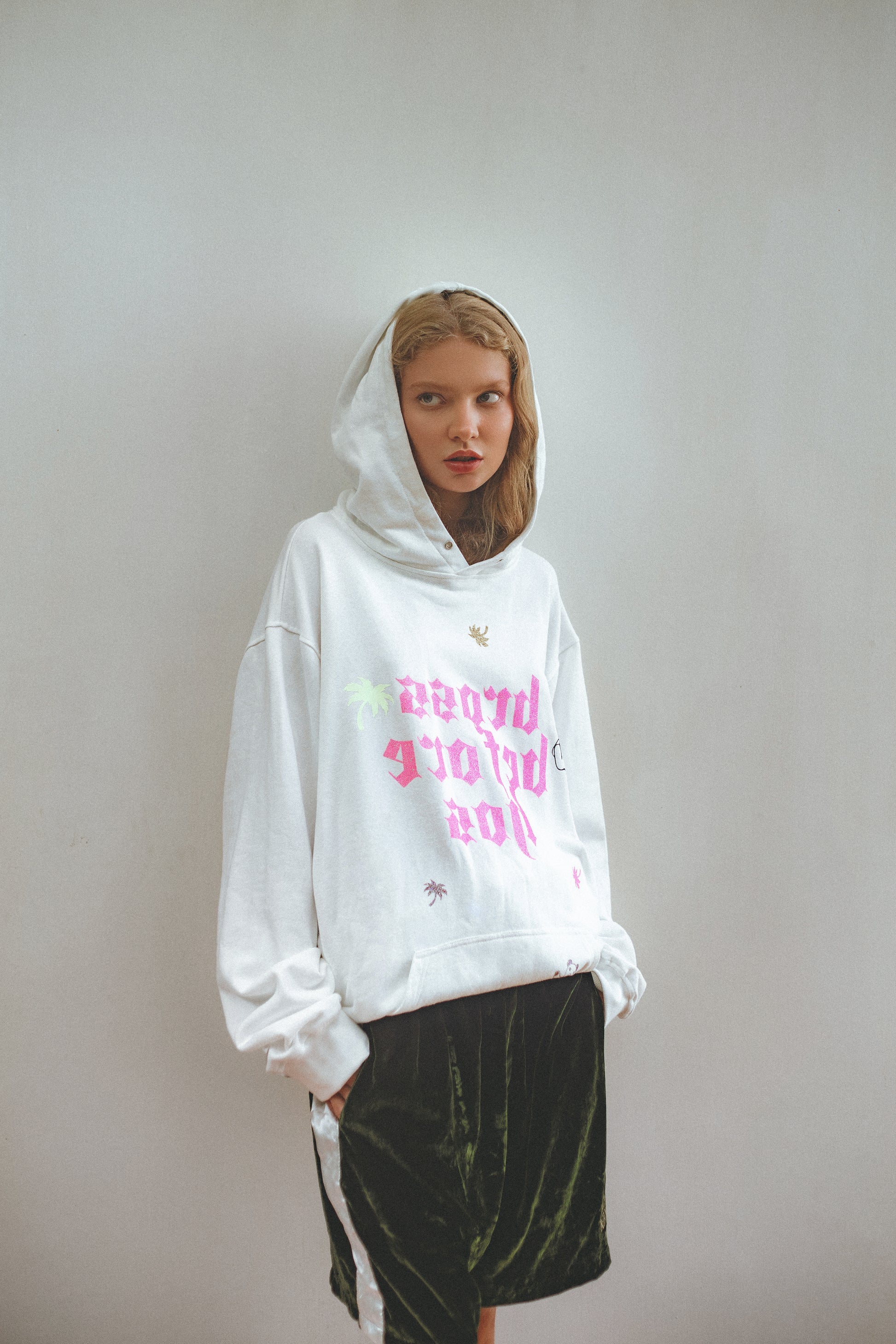 Embroidery on the back: “Palm Models”.